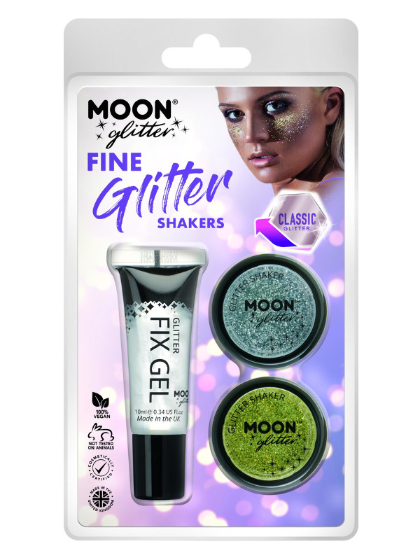 Moon Glitter Classic Fine Glitter Shakers, Clamshell, 5g – Fix Gel, Silver, Gold